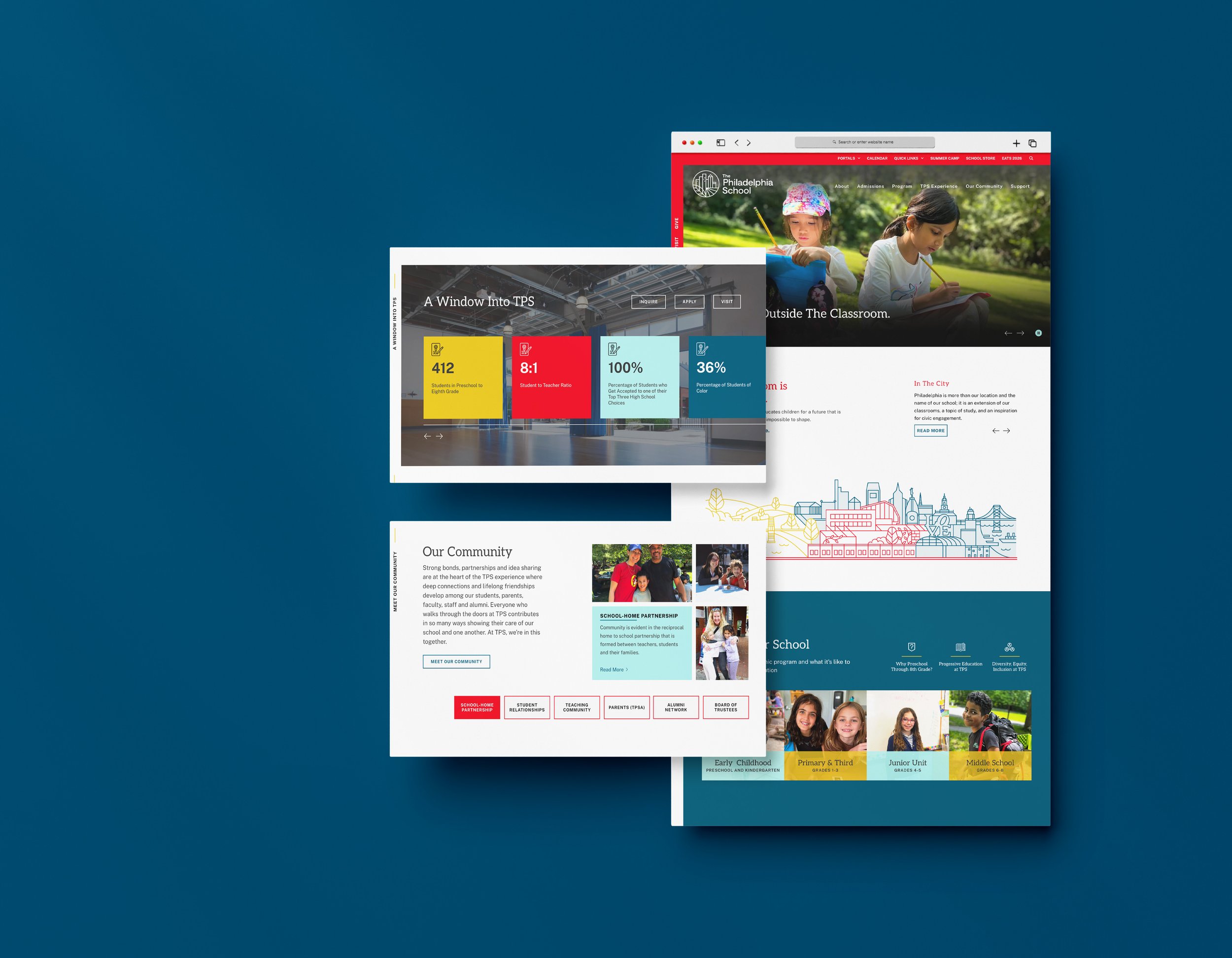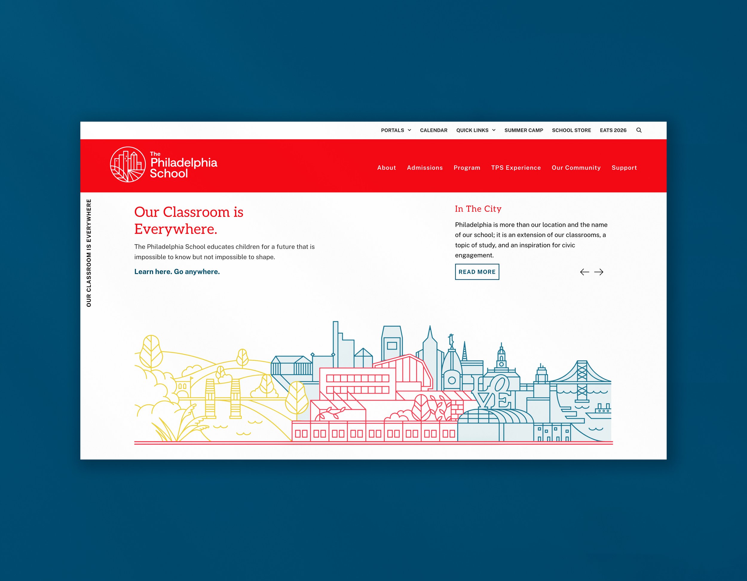 The The Philadelphia School website features a clean, modern design that emphasizes experiential learning through bold typography, engaging imagery, and interactive elements. Its layout highlights the school’s “classroom everywhere” philosophy, showcasing learning across the classroom, city, and natural environments to reinforce a hands-on, inquiry-based approach. The site effectively balances storytelling and navigation, guiding users through academic programs, community values, and admissions with a clear, visually cohesive structure.
